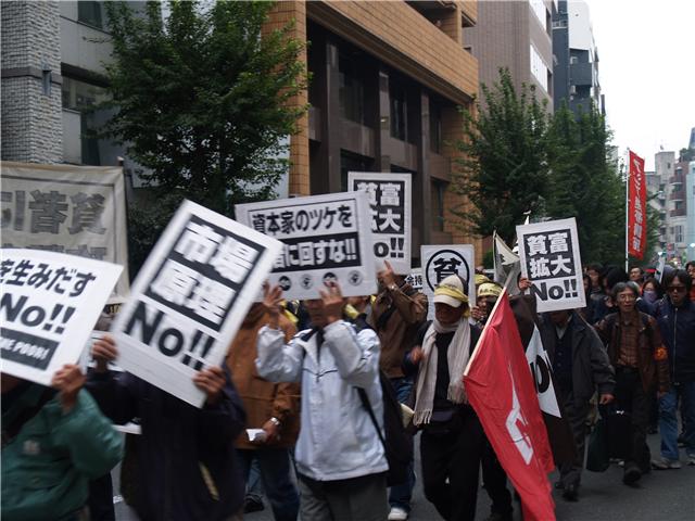恵比寿から渋谷を一周し宮下公園で解散、途中、渋谷署の前では出てこい麻生リアリティーツアーで不当逮捕された仲間に向け「渋谷一号がんばれ!」「不当逮捕を許さないぞ!」とシュプレヒコール。宮下公園ではのじれんと、山谷の仲間を中心に共同炊事を行い解散した。