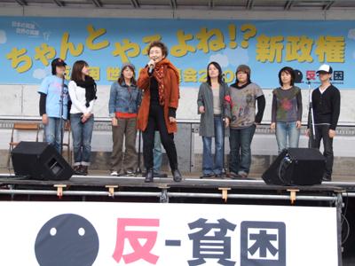 「反貧困ネット」共同代表の宇都宮さんが「昨年、明治公園で集会を開き、全国に種をまき今年芽が出た。18都道府県に反貧困ネットが活動している。年越し派遣村運動の流れが政権交代を作り出し、湯浅誠さんが国家戦略室の政策参与になった。年末にかけて雇用は悪化している。政府が緊急対策をとってほしい。貧困のない社会を実現しよう」と開会のあいさつをした。