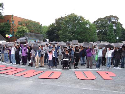 加藤登紀子さんのすばらしい歌によって会場は一体化した。セネガルの踊りのパフォーマンス、北海道から山口まで全国から参加した反貧困ネットの報告が行われ、反貧困の「ロゴマーク」を人文字にし、STAND UPアクションを行った。そして、日本の貧困削減目標作成の呼びかけと集会宣言を採択した。
