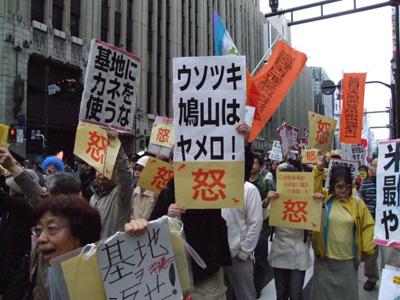 5月28日、日米共同声明で普天間基地の移設先を辺野古先地区周辺としたことに対して、次々に怒りの発言が続いた。「今回の決定が沖縄の切捨てであり差別である。基地は暴力、騒音・環境被害をもたらす。レイプ事件も相変わらず起こっている。基地被害を沖縄に押しつけるな」。
