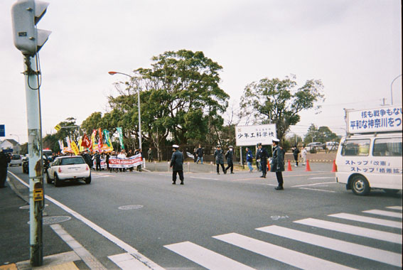 南側の門に向かって歩いていくと、機動隊が阻止線を張っている。警官は「車道に出るな」「トラブル防止のため」とか言ってくる。だが門の前には右翼団体の掲げる日の丸が無数にひるがえっている。「右翼がいい位置にいてなぜわれわれは通行できないのだ」という抗議に対し、警備責任者らしき人は「早い者勝ちだ」とつぶやいた。確かに右翼は早く到着したのだろうが、明らかに神奈川県警は抗議する人と、右翼とのすみわけを利用して「スムーズな警備」「スムーズな搬入」をおこなおうとしているだけだった。