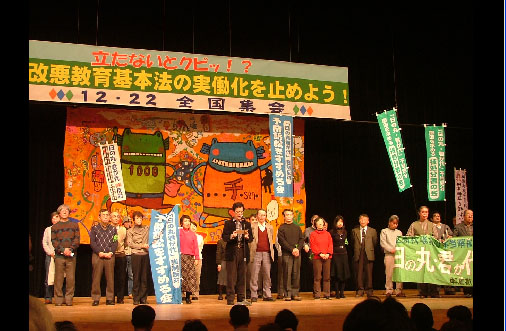 しかし、卒業式・入学式での不起立者の闘いが続き、都教委の不起立者をゼロにする目標を次々と破産に追い込んでいる。とりわけ根津公子さん(南大沢学園養護学校) に対しては免職処分の危険があったが、二月~三月にかけた果敢な闘いによって「解雇」攻撃をはねかえした。集会は、根津さんの免職処分を阻止した闘いの成果を確認し、「10・23通達」と不当処分の撤回を掲げ、スクラムを打ち固めた。