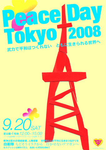 WORLD PEACE NOWは9月20日に東京・芝公園4号地で予定していた「Peace Day Tokyo 2008」を、残念ながら中止することをお伝え致します。理由は台風13号の接近のため、当日、東京は台風の直撃を受けることが予想されるためであり、ピースデーが予定していたブース出店や、さまざまな民族音楽などの演奏に重大な支障が生じるおそれがあるからです。