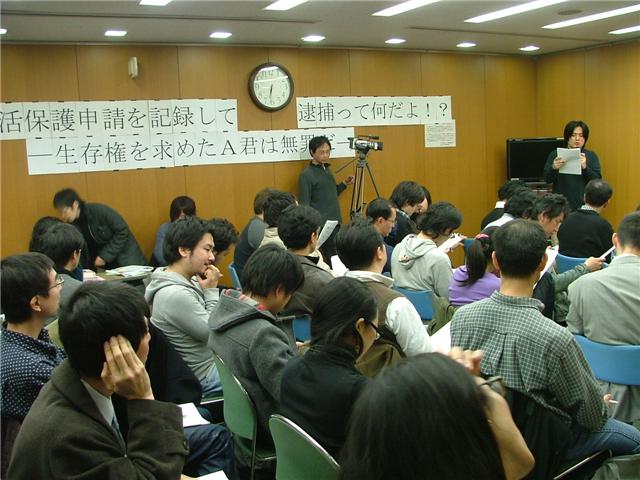 12月23日、「『生活保護申請を記録して逮捕って何だよ?!』─生存権を求めたA君は無罪だ─」集会が大久保地域センターで行われた。主催は、フリーター全般労働組合など実行委。