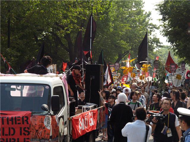 本日開催された「7・5チャレンジ・ザ・G8サミット1万人のピースウォーク」は世界各国からの5千人の参加を得て、平和的に行われました。しかし、そのピースウォークにおいて、機動隊の過剰警備があり、4人の参加者が逮捕拘束されました。私たちは、この逮捕に対して強く抗議し、即時釈放を強く求めます。
