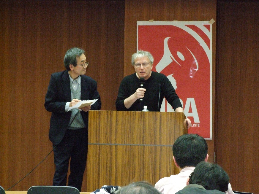 次にレオンさんの話を受けて、辻和夫さん(自治体労働者)と西山直洋さん(連帯労組関生支部)があいさつした。辻さんは「日本では年金改悪があっても闘争にならなかった。フランスの反資本主義的新党NPAの民主主義的な闘いの方法を学ばなければならない」と語り、西山さんは「関西生コンの闘いは連続ストで闘ってきたが再度ストを打つかどうか、十一月三十日の最終集団交渉にかかっている。入り口のセメント業界、出口のゼネコンとの狭間にいる中小生コン企業といっしょになって正規・非正規を守る闘いを行っている。こうした産業別労働運動を広げていかなければならない。そして社会変革のためには青年労働者の力が必要だ。いかに枠を広めていくのかが挑戦していきたい」と述べた。