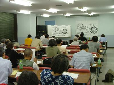 二人の話の間に、神奈川の会の仲間がAPECにまつわる治安問題を話した。神奈川県警はAPEC警備としてすでに様々な訓練を行い、イギリスから専門家を招いてシンポを開く予定もあるようだが、実際には9.11テロのアルカイダ、サリンをまいたオウム真理教、一昔前の左翼団体の印象を混ぜ合わせて、APECはテロ対策の場であることを宣伝している。神奈川の会の仲間はその設定のこっけいさに触れながら、桜木町駅前での野宿者排除、地域住民協力体制の形成を考えれば、APECを利用した監視体制を許さないという何らかの行動が求められると呼びかけた。