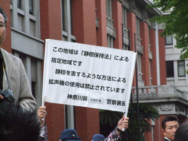 「外国公館等周辺地域」の「静穏」を「保持」するというならば、何よりAPEC会場で音量が測られるべきであり、ましてや基準も示さないままにマイクをスピーカーにくっつけて音量を測って「逮捕するぞ」と恫喝する。言わば、法定速度の定められていない道路でスピード違反の取り締まりをやるような暴挙であり、この「静穏保持法」の適用と一連のデモ規制のやり方は法治と民主主義を根本から破壊するものだと指摘せざるを得ません。国が憲法21条が保証している表現の自由を侵すことは、国家権力の濫用に他なりません。