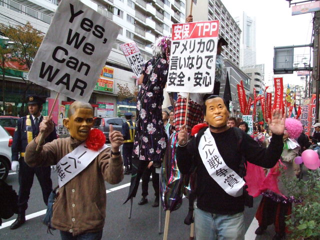 11月13日に行われた、「"いらない!APEC"横浜民衆フォーラム」主催のデモ行進において、前原外相の命令で私たちのデモコースの一部を含めて「静穏保持法」(国会議事堂等周辺地域及び外国公館等周辺地域の静穏の保持に関する法律)を適用したことと、そしてそれに伴う警察のデモ規制の過剰警備に抗議します。