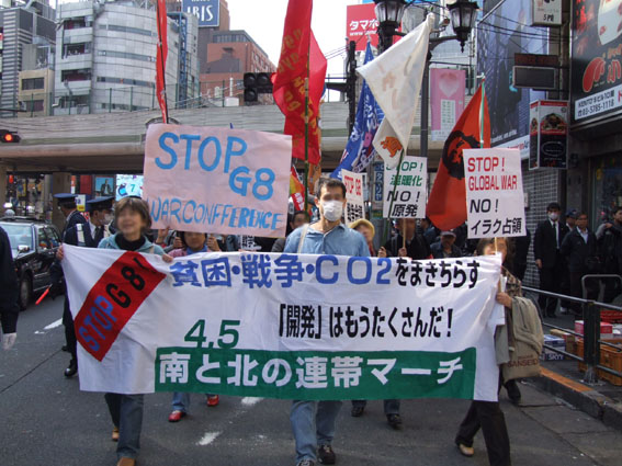 The demonstration was advertized as "It is a measure against global warming to stop war", "Don't build a nuclear power plant" "NO G8!" and "No to the development for global business", and "Stop the Iraq - Afghanistan occupation."