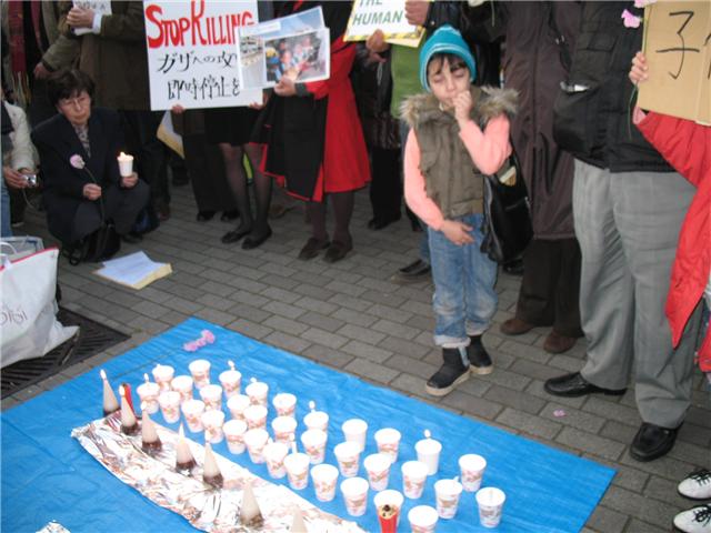 続いて午後4時から同じくイスラエル大使館前で、パレスチナ子どものキャンペーン、アムネスティ・インターナショナル日本、ピースボート、日本国際ボランティアセンター(JVC)などのNGOが呼びかける「死者のための追悼と、軍事行動の即時中止を求める集会」が行われた。二時からの行動の参加者もこの集会に合流し、約300人が集まった。