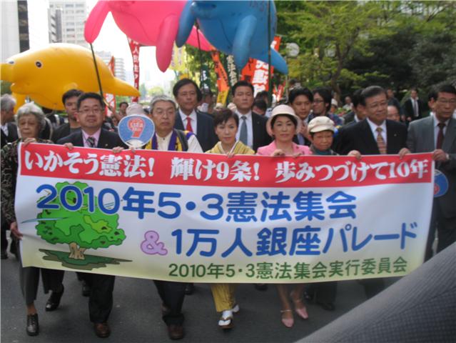 第2部は、社民党の福島みずほ党首と、NPT再検討会議出席のため訪米中の志位委員長に代わってこの集会に参加した共産党の市田忠義書記長の発言。福島社民党党首は「三党連立合意」の中に「憲法の理念を生かす」を盛り込んだことの意義を強調するとともに「貧困・核兵器廃絶・改憲手続き法・普天間基地」の問題に全力で取り組むと語った。福島さんは辺野古移設は埋め立て案も桟橋案もダメと確認し、グアム。テニアンへの移設を主張した。