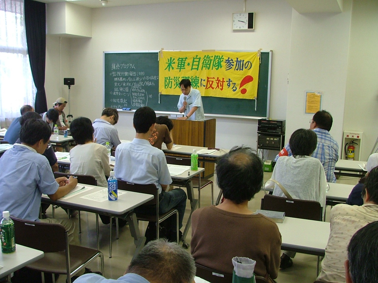 米軍ヘリも負傷者・物資運搬任務として位置づけて共同作戦を展開した。このように防災訓練は、国民保護条例下、防災・防犯・防テロの一体化をめざし、戦争動員訓練として確実に強化してきた。実行委は、2000年の「ビッグレスキュー」防災訓練=戦争・治安訓練に抗議するとともに、石原都知事による「外国人が災害時に騒擾を起こすおそれがある」などという差別・排外主義発言を糾弾し続け、荒川・墨田区での関東大震災時の朝鮮人虐殺が集中した歴史にこだわり防災訓練反対運動を取り組んできた。集会は、今年の防災訓練の総括と今後の方向性をたぐり寄せるために行われた。