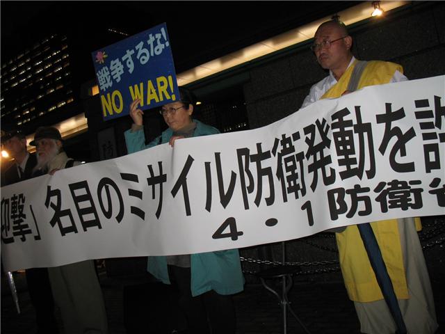 4月1日午後六時過ぎ、麻生政権が北朝鮮の「人工衛星」発射通告に対して発令した「弾道ミサイル破壊措置命令」という臨戦態勢に抗議して、PAC3部隊が配備された東京・市ヶ谷の防衛省前で緊急行動が行われた。呼びかけたのは、「『迎撃』名目のミサイル防衛発動を許すな!4・1防衛省行動実行委員会」で、埼玉、千葉、東京、そして浜松からも70人が駆けつけた。