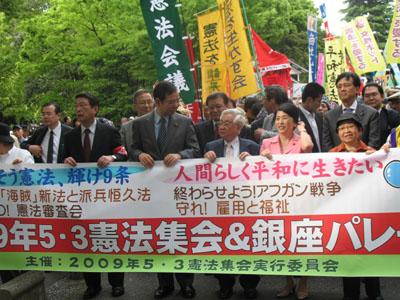 五月三日の憲法記念日、小泉政権の登場に合わせて共産党と社民党の両党首がそろって発言する「日比谷憲法集会」が開催されるようになってから九年目となる。今年の5・3憲法集会は「終わらせようアフガン戦争」「いらない!ソマリア『海賊』新法と派兵恒久法」「始動NO!憲法審査会」「守れ!雇用と福祉」をサブスローガンにして日比谷公会堂で開催され、集会終了後に東京駅まで「銀座パレード」を行った。集会には四千二百人が参加し、例年のように会場に入りきらなかった人は、公会堂前に設置されたオーロラビジョンで集会の模様に見入った。