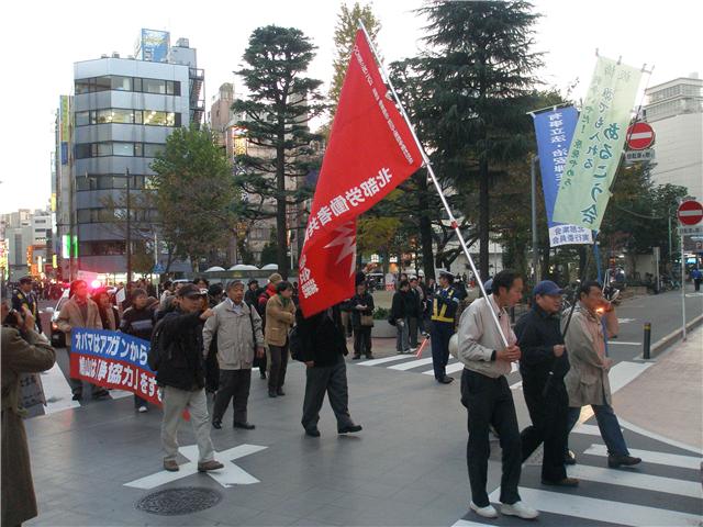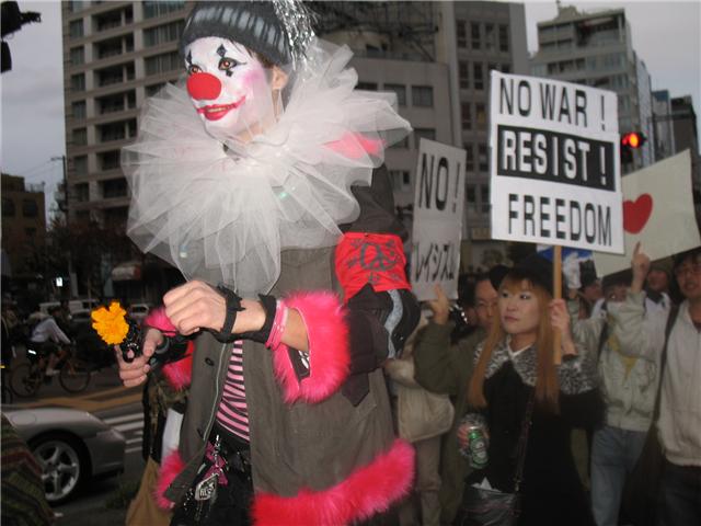 16時から、新宿に向けてデモに出発。4メートルの高さの「はんせん・ていこう」と書かれた新登場の巨大バルーンを先頭にして、もはやデモでおなじみになった「竹馬足長男」は、この日さらに30センチ高くなって登場。死神オバマやサンタクロースなどの仮装に続いて太鼓部隊、そして恒例のサウンドカーも出て、賑やかに「沖縄基地撤去」「アフガン戦争を止めろ」「反戦!抵抗!自由!」とアピール。年末を控えてごった返す新宿駅周辺で、多くの人々が携帯などでデモを写真に撮り、警官の不当な制止・規制を越えて飛び入り参加した人々も少なくなかった。
