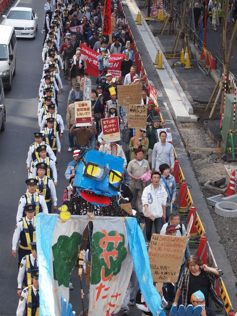 続いて渋谷までのデモに出発した。巨大なパペット「宮下さん」を先頭に渋谷を一周して宮下公園までにぎやかにデモを行った。