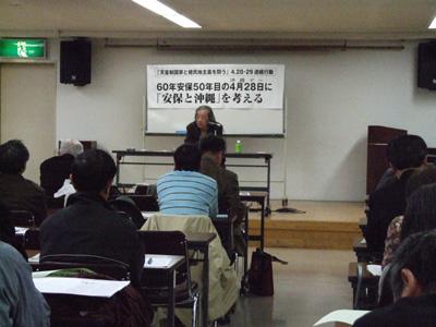 4月28日、文京区民センターで「天皇制と植民地主義を問う」4・28--29連続行動、「60年安保50年目の4月28日に「安保と沖縄」を考える」が新しい反安保行動をつくる実行委員会主催で開かれ、七十人が参加した。