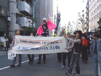 最初に主催者を代表して反天皇制運動連絡会の新孝一さんが発言。新さんは、昭和天皇裕仁の誕生日だった4月29日が2005年の祝日法改悪によって「みどりの日」から「昭和の日」になった経過を説明し、昭和天皇の戦争責任追及の声が決して小さなものではなかったために、いったん「みどりの日」というクッションを置いた形でないと、批判をかわせなかったのではないか、と語った。そして今こそ韓国併合百年・安保改定五十年の今年に、あらためて過去の植民地支配と今日の植民地主義を貫く批判の立場と行動が必要だ、と訴えた。