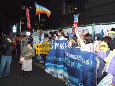五月十四日午後六時半から、「沖縄に基地はいらない国会を囲むヒューマンチェーン」が「沖縄に基地はいらない」全国同時アクションTokyoの主催、協賛:WORLD PEACE NOWで行われ、四百六十人が参加した。四月二十五日、九万五千人の沖縄県民大会と連帯し、明治公園で「NO BASE 沖縄」のキャンドルを成功させた「全国同時アクション」実行委が呼びかけたものだ。
