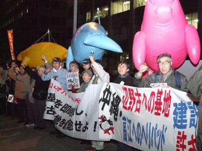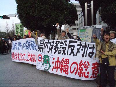 北澤防衛相が中井真沖縄県知事と会談し、政府案なるものを説明した。結局、現在進められているのは、キャンプシュワブへ五百メートル級のヘリパッドを作り、ヘリ訓練の一部を徳之島など本土内で行う、そして、いずれは勝連沖を埋め立てて、両方の機能を集約するというものだ。これでは基地機能の縮小や県外・国外移設などではとうていなく、逆に基地機能を巨大化し、強化するものにほかならない。こうした鳩山政権の基地問題に対する対応に抗議して、申し入れ行動を行った。