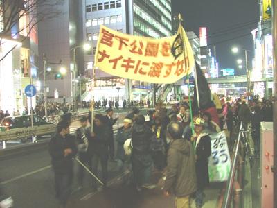 ところが3月10日の区議会都市環境委員会で区は、「4月1日工事着工」を明らかにし、強引に行おうと態勢を作りはじめた。守る会は、渋谷区=ナイキに対する世界同時抗議行動として3・31緊急デモを行い、そのまま公園に泊まり込み阻止する陣形を打ち固め、反撃していった。さらにアピールに応えてオーストラリア・シドニーの仲間は、日本国総領事館前で、チラシ配布、宮下公園の行動の写真展示会を行った。フランス・パリでは、NO―VOXがシャンゼリゼ通りのナイキショップ前で抗議行動を展開した。続々と支援メッセージが届いている。
