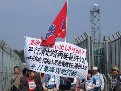 空港会社は、昨年10月22日、平行滑走路の2500メートルを完成させて供用を強行した。森中社長は「B滑走路をさらに北へ、東関東道の上(道路を横切る位置という意味)まで延ばし、3000、3500メートルまで延ばすこともありうる」(朝日新聞09・10・23)と明らかにし、三度目の延長を策動している。当然、北側に延びることによって騒音地域は拡大していく。地元住民の不安、反発はあったが抑えこんでしまった。このような再延長の本当のねらいは、東峰住民に対する政治的圧力であり、追い出していくことにある。
