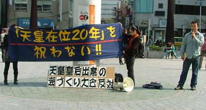 いま、11月1日の集中情宣などの準備に入り、11月12日当日には、奉祝式典がおこなわれる皇居前広場にほど近い、東京・銀座での集会とデモを計画しています。私たちは、このかん各地で、さまざまなかたちで「天皇即位20年奉祝」に異議申し立てをおこなってきた仲間たちに対して、この11月12日のデモに、全国から結集されんことを訴えます。
