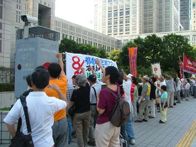 都教委包囲・首都圏ネットは、8月28日、都教委がある都庁第二庁舎前で「石原都知事は即刻退陣せよ!東京都杉並区の『つくる会』教科書採択弾劾!改悪教基法の実働化と闘おう!」をメインスローガンに掲げ、集会と都知事、都教委への申し入れ行動を行った。全国の闘う仲間たちも駆けつけ250人が参加した。