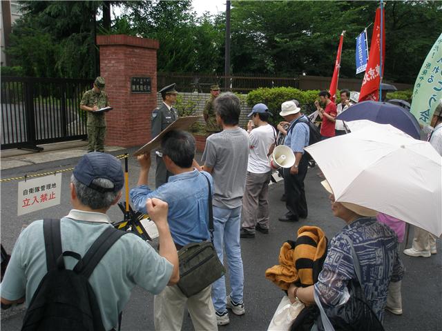 一時半から行われた集会ではまず実行委員会の仲間が基調提起を行った。四月五日に朝霞基地に対してPAC3の移動展開に反対する申し入れ行動を行ったことや、四月十二日の練馬駐屯地祭に対する監視、抗議行動などを報告した後、六月十九日の「海賊対処法」成立や米軍再編など日米安保体制の強化、派兵国家化に対して地域から反基地の闘いを作っていこうと訴えた。