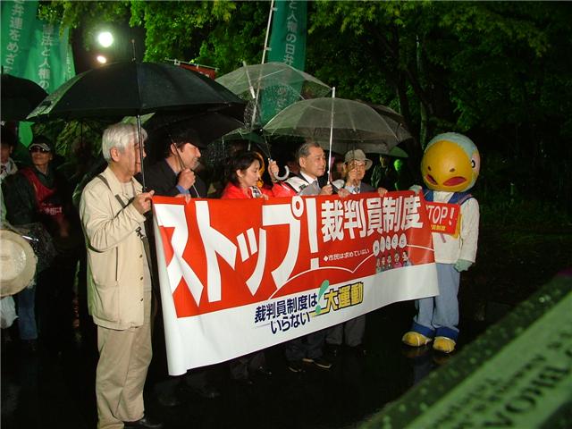 5月21日の裁判員制度の実施強行を阻止するために参加者は、あらためて裁判員制度が思想・信条・良心の自由を侵害し、明らかに憲法に違反していること、さらに被告人の人権を侵害し、防御権の行使をする余地もなく、えん罪がますます増えることなどを厳しく批判し、会場は残された一カ月間を全力で反対運動を展開しいこうとする緊迫感に満ちていた。国会、法務省、最高裁、日弁連にむけて抗議のアピールが次々と行われた。