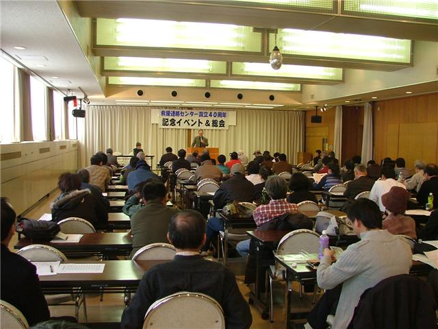 3月21日、救援連絡センターは、豊島区勤労福祉会館で「設立40周年 記念イベント&総会」を行い、約100人が参加した。