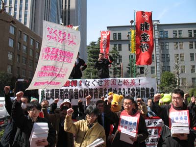 3月5日午前11時半から、東京・霞ヶ関の日本郵政グループ本社前で、郵政非正規労働者の均等待遇を求めて「09春闘勝利! なくせ貧困と格差! 非正規雇用労働者の均等待遇を求める3・5本社前集会」が行われた。郵政産業労働組合、郵政労働者ユニオン、郵政倉敷労働組合によるこの集会には、非正規の期間雇用職員を先頭に全国から200人の郵政労働者が参加した。