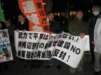 2月16日、WORLD PEACE NOWは、1月20日のオバマ米大統領就任式に向けた「オバマさんへの平和の手紙アクション」に続き、米大使館近くの虎の門JTビル前で「クリントン国務長官への要請行動」を六十人の参加で行った。数日前の初夏を思わせる天候とは一転した寒風の吹く中で、沖縄・一坪反戦地主会関東ブロックの吉田さん、日本山妙法寺の武田上人、キリスト者平和ネット、ふぇみん婦人民主クラブ、許すな!憲法改悪・市民連絡会、憲法を生かす会などからイラク・アフガン戦争、米軍再編、沖縄新基地建設に反対するアピールが次々に行われた。