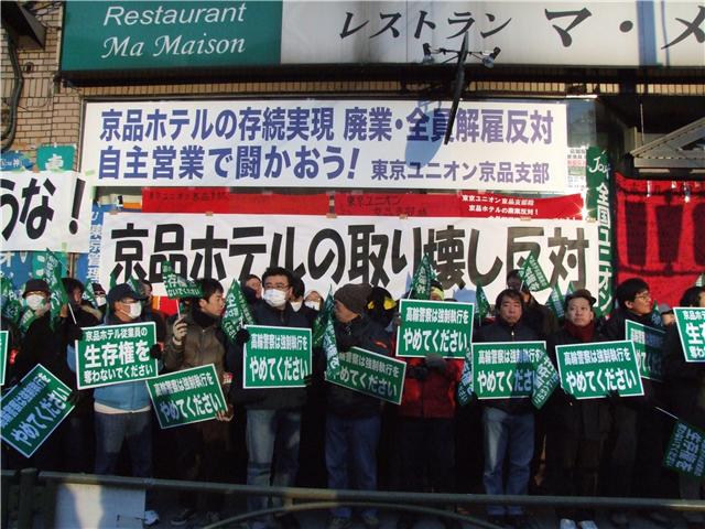 1月25日、解雇撤回を求めて京品ホテルを占拠・自主営業を続けていた東京ユニオン・京品ホテル支部に対して、東京地裁は立ち入り禁止・排除の不当な強制執行を行った。