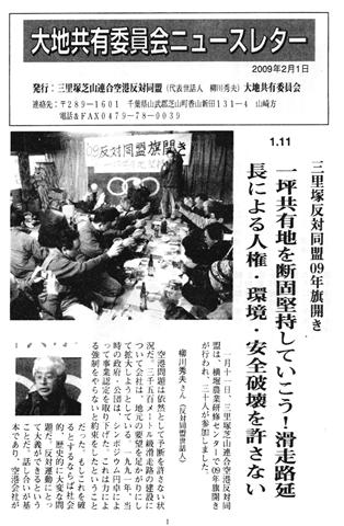 このような空港会社の暴挙を絶対に許さない。三里塚芝山連合空港反対同盟(代表世話人 柳川秀夫)は、〇九年旗開き(1・11)で「一坪共有地堅持」を掲げ、空港会社の平行滑走路供用強行にむけた東峰住民追い出し攻撃と連動した一坪共有地強奪を許さないことを意志一致した。すでに反対同盟大地共有委員会によって「一坪共有地断固堅持」を訴えるニュースレターを配布し(08・9)、「声明 空港会社による一坪共有地の売却要請手紙に抗議し、共有地を断固堅持する」(08・12・26)を全国に訴えた。さらに一坪共有地提供者である加瀬勉さんは、アピール「我々は三里塚一坪共有地の売り渡しを断固拒否する」(08・12)を空港会社に突きつけた。