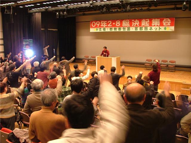 都教委包囲ネットは、「主任教諭制度」など教員評価制度導入などの改悪教基法の実働化阻止、「10・23通達」と処分撤回、「7・15分限指針」撤回を柱に、今春の闘いにむけた意志一致をかちとった。