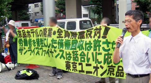 この一方的な解雇の背景にリーマン・ブラザーズ系列の悪質金融資本サンライズファイナンスの債権回収にあることが、今年5月からの組合側の追及によって暴露された。ホテルの営業利益はすべてサンライズファイナンスへ吸い込まれ、累積債務は合計60億円にもなるという。従業員を路頭へほうり出しLCホテル(サンライズファイナンスのペーパーカンパニー)へ土地建物を売却するという暴挙に対して、従業員は東京ユニオン京品支部を結成。10月20日に品川駅前で「廃業反対・自主営業突入宣言集会」を行い、本格的な闘いが開始された。敵はすでに京浜実業から悪徳「ハゲタカファンド」へ変わった。組合はサンライズファイナンス、買い手のLCホテルとその社長宅などへの抗議行動を精力的に展開してきたのだ。