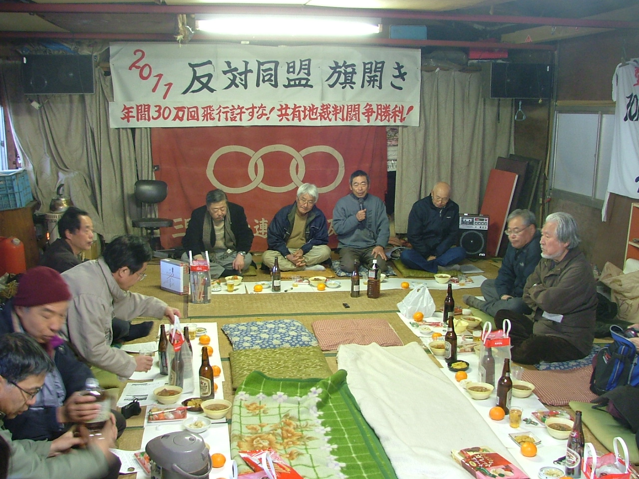 三里塚芝山連合空港反対同盟は、1月16日、横堀農業研修センターで「年間30万回飛行許すな!共有地裁判闘争勝利!2011年反対同盟旗開き」を行い、40人が参加した。
