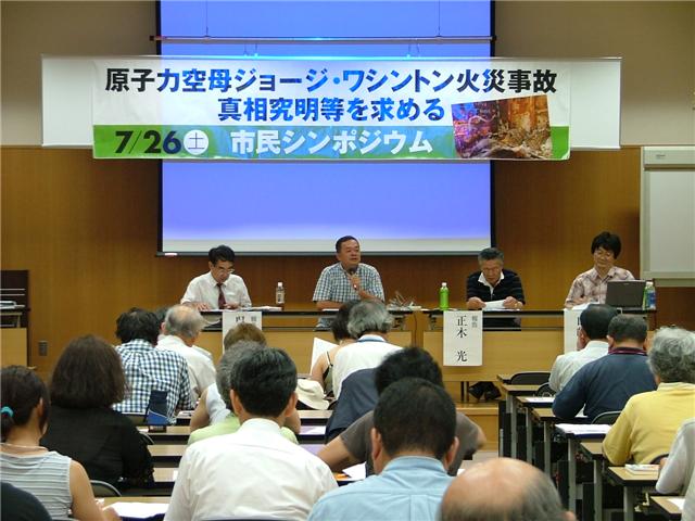 7月26日、原子力空母母港化の是非を問う住民投票を成功させる会は、横須賀・ウエルシティで「原子力空母G・ワシントン火災事故真相究明等を求める市民シンポジウム」を行い、90人が参加した。