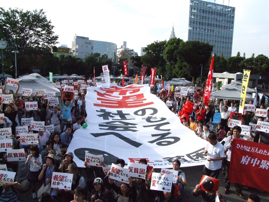 「反貧困集会は三回目になる。昨年政権交代が起こったが反貧困状態はなかなか変わっていない。非正規は仕事すらない。では、希望はないのか。政府は去年貧困率を戦後初めて発表した。平均で一五・七%、一人親世帯では五四・三%だ。これまでの政府は日本には貧困はないと言っていたから、われわれは昨年衆院選前に、貧困率を発表し、その削減目標を発表すべきだとせまっていたからだ。しかし、現政権は貧困率を発表しただけで、削減目標や体系的政策を打ち出していない」。