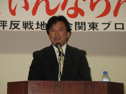 「本日の集会は武力で平和はつくれないことを確認し、発信していきたい。アフガン戦争では、いったんやめた兵士に武器を与えている。イラクでは戦争の終結をうたっているが、戦争を民間組織に委託して継続しようとしている。さらに、尖閣諸島問題では、日米同盟の範囲が及ぶところだと日米政府はしているが、中国では反日デモが再び起こっている。普天間基地の閉鎖、辺野古に新基地を作らない。日米安保ではなく、友好的な日米関係を築いていくことが重要だ」。