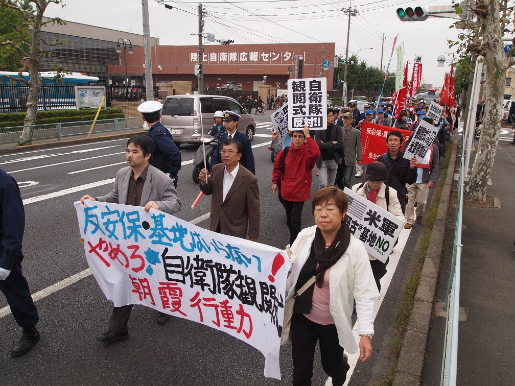 朝霞駅南口で朝九時半より行われた集会では実行委を代表して東水労の仲間が発言し、「民主党・管政権の元で新安保懇や、今回の観閲式への米軍の初参加など日米の軍事一体化が進められ、沖縄に対しても日米合意の基、基地を押しつけようとしている。」「十条、練馬北町など東京北部における反基地の闘いなどを