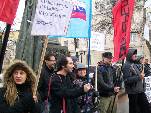 ▲フペリョードのメンバーによるカザフスタンの石油労働者のストへの連帯行動(モスクワ)