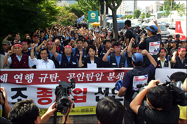 金属労組がチョン・ガプドゥク委員長を不法に強制暴力連行した警察の暴挙を強力に糾弾して、李明博政権を相手にゼネストなどによる総力闘争を宣言した。