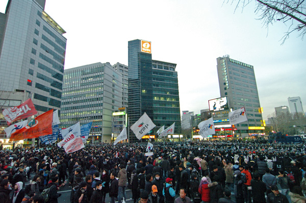 2月28日、ソウル都心で労働者、学生、市民3万人が結集して、「李明博殺人政権糾弾」の闘いを戦闘警察の暴力的鎮圧作戦を跳ね返して貫徹された。