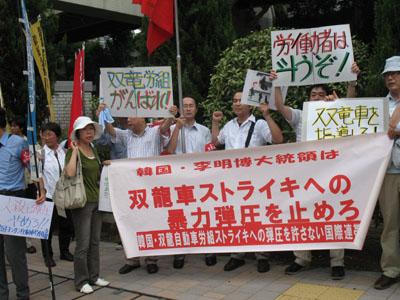 8月6日、弾圧に反対し、双竜労組に連帯する国際行動が各国で行われた。日本でも全労協、全日建連帯労組、全国一般全国協、全統一、APWSL(アジア太平洋労働者連帯会議)日本委員会などが呼びかけて「韓国・双竜自動車労組のストライキへの弾圧を許さない国際連帯行動」が取り組まれ、50人が結集して午後1時半から韓国大使館に向けた抗議行動をうちぬいた。